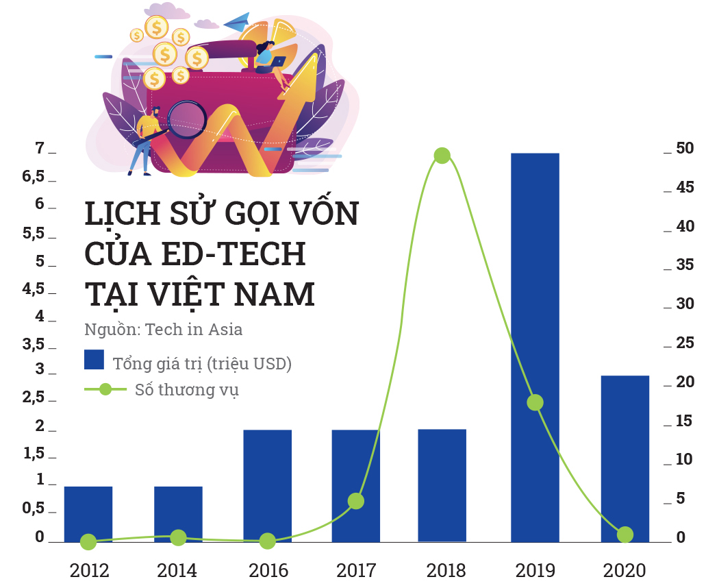 Chính vì thế, không có gì lạ khi các công ty Ed-Tech, các giải pháp giáo dục trực tuyến được quan tâm đầu tiên trong bối cảnh dịch bệnh vẫn chưa được kiểm soát hoàn toàn. Dù khá sôi nổi từ đầu năm nay nhưng phải nhìn nhận rằng các khoản đầu tư vào Ed-Tech ở Việt Nam đang đi xuống từ năm 2019. Từ con số 7 công ty nhận đầu tư với tổng giá trị hơn 18 triệu USD, đã giảm đột ngột còn 3 công ty với tổng giá trị chưa tới 1 triệu USD hồi cuối năm ngoái. Nếu chú ý kỹ hơn, quy mô đầu tư Ed-Tech Việt Nam chạm đỉnh 50 triệu USD (Topica năm 2018) cũng đã giảm từ đó đến nay.