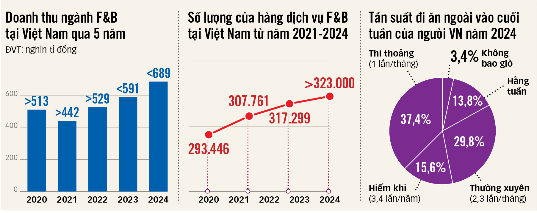 Bức tranh ngành F&B ở Việt Nam Nguồn: VIRAC, Eurromonitor, iPOS.vn – Số liệu: THẢO THƯƠNG – Đồ họa: TẤN ĐẠT