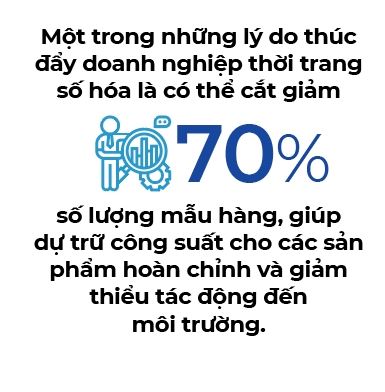 Tuy nhiên, doanh nghiệp nên chuyển đổi số để tạo ra giá trị dài hạn, chứ không phải vì mục đích tiết kiệm trong ngắn hạn. Bởi vì thương hiệu cần nhiều thời gian và nguồn lực để chuyển đổi từ thiết kế 2D sang 3D. Một trong những lý do thúc đẩy doanh nghiệp thời trang số hóa là có thể cắt giảm 70% số lượng mẫu hàng, giúp dự trữ công suất cho các sản phẩm hoàn chỉnh và giảm thiểu tác động đến môi trường. Bên cạnh đó, khi kết thúc quá trình chuyển đổi số, ước tính, doanh nghiệp có thể sẽ giảm 20% số lượng nhân sự cho toàn bộ quy trình.