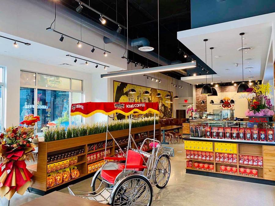 Không gian quán TNI King Coffee tại Hoa Kỳ được thiết kế kết hợp giữa văn hóa Đông – Tây, gợi nhắc về đất nước và con người Việt Nam. Khu vực take-away mang lại cảm giác tiện lợi, thoải mái cho du khách. Cách sắp đặt bàn ghế cho khách ngồi thưởng thức tại quán cũng đảm bảo khoảng cách tối thiểu để phòng ngừa Covid-19.